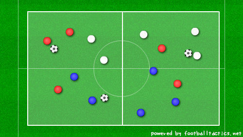 コートを半分にし、『 片方のエリアでは3本しかパスできない 』ルールを追加。強引にサイドチェンジさせる。