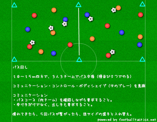 3人3チームを、10m四方に入れて、チーム同士のパス交換。もちろん動きを入れて。