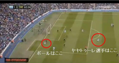 ◎ シーン1:ボールを受ける前の、ヤヤ・トゥーレ選手とDF、ゴールの位置関係を見ておこう!