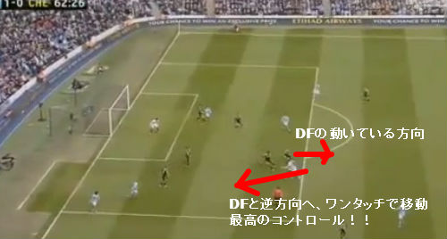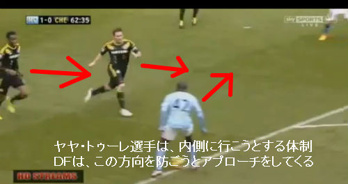 当然DFは詰めてくる。ここでボールを受けたら、君ならどうする? 僕なら内側( ゴール正面側 )にコントロールしてシュートっていうイメージ。だけど ヤヤ・トゥーレ選手は違ったよ!