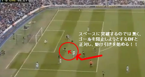 このシーンが凄い。バルサのイニエスタとかも良くやるね。僕らなら目の前にあるDFの間に突っ込んでしまいそうなところ。しかし、目の前のDFとあえて正対し、駆け引きする選択。