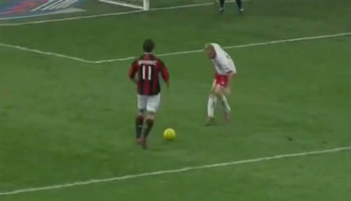 また、ジャンプから着地をしたときの敵(DF)は、左方向へ体重がかかってるのが分かる。イブラヒモビッチは、その一瞬の隙をついて右へ移動しシュートへ移行。