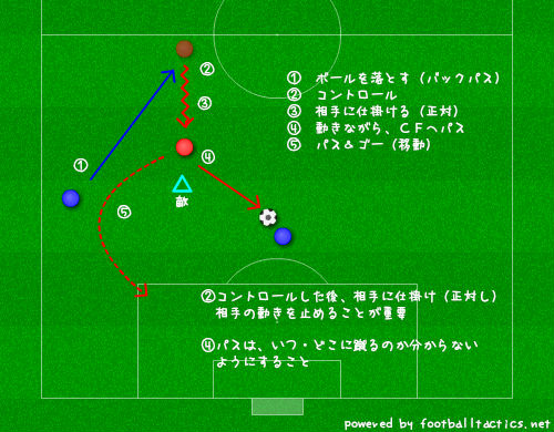 注意点としては、” ワンタッチプレーにこだわらない事 ” 。DFとの距離感、FW1とFW2のタイミング、パスの質を意識することが大切なので、ワンタッチでプレーが出来るかどうかはその時の状況で異なる。しかし、突破の推進力・スピードにはこだわりたいので、” 流れが止まらない事 ” を意識するといいと思う。