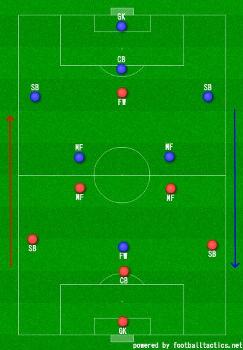 この形でMFにボールが入ったとき、FW、MF、SB(攻撃参加)の関係で、いくらでもワンツーが出来る関係が作れる。積極的に攻撃参加を意識するトレーニングにもなり、オーバーラップの状況判断も養える?多くのことを望んではいけないが、” 突破 ” するためのアイデアが沢山でそうなフォーメーションだと思う。