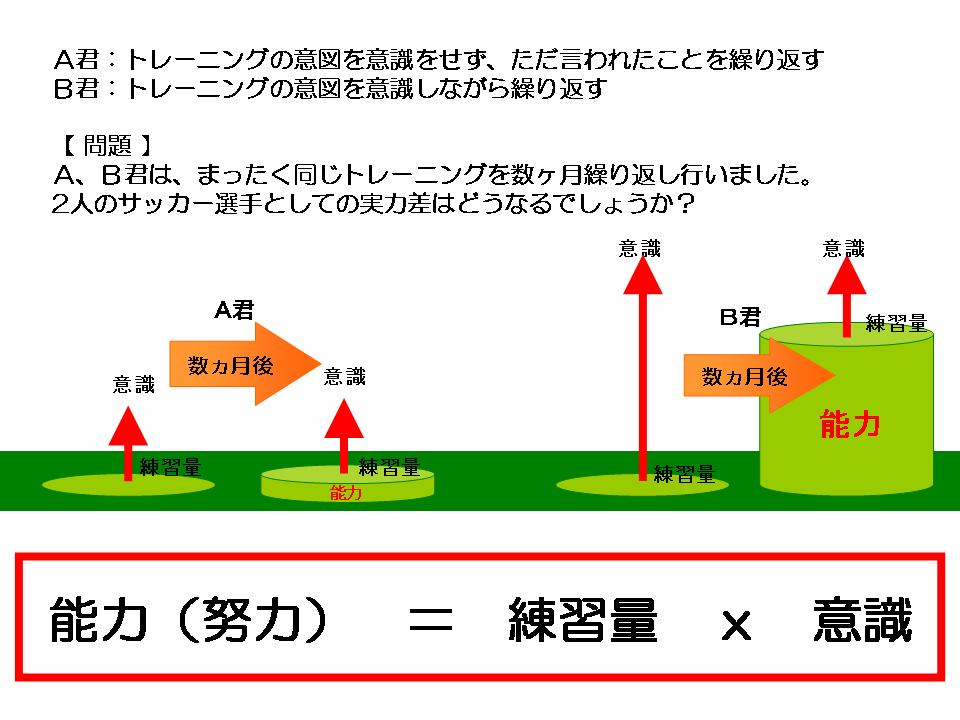 ためである。では、努力とはなにか。ここで、簡単な公式を知っておくと良い。サッカーだけでなく、勉強・ダンス・音楽など様々な夢に向かっていくとき、絶対的に必要な2つの要素で努力を表現する。